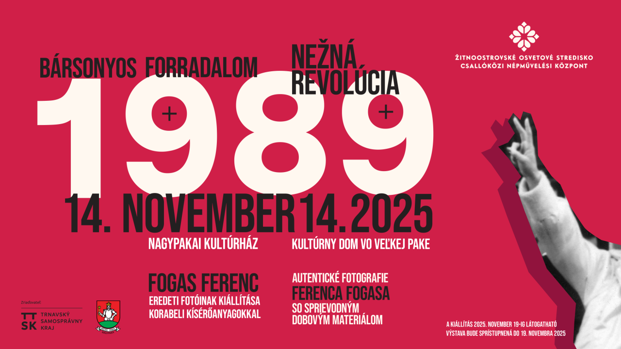 V spolupráci s Žitnoostrovským osvetovým strediskom v DS, Vás pozývame do kultúrneho domu na výstavu fotografií s názvom: NOVEMBER 1989. Výstava bude prístupná: