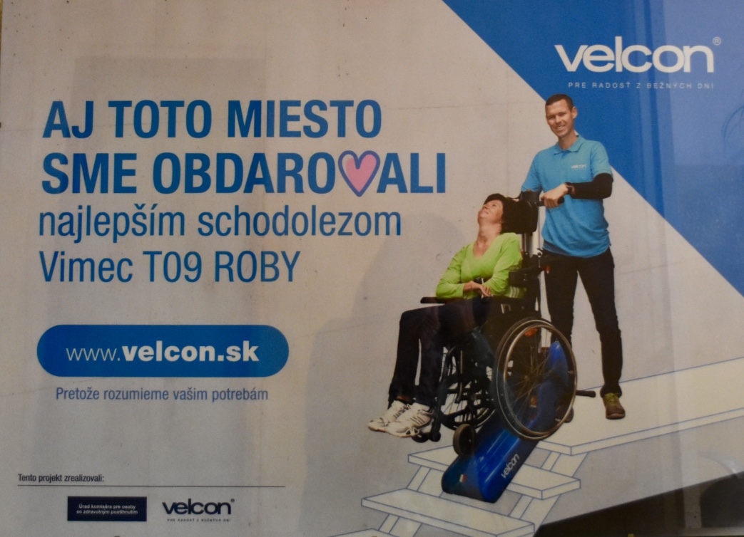 Vďaka spoločnosti Velcon s.r.o. a Úradu komisárky pre osoby so zdravotným postihnutím naša obec obdržala schodolez, ktorý pomôže Miške zdolávať schody v ZŠ, ale aj iným osobám v našej obci, ktoré ho budú potrebovať. Ďakujeme!